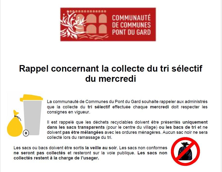 La communauté de Communes du Pont du Gard souhaite rappeler aux administrés que la collecte du tri sélectif effectuée chaque mercredi doit respecter les consignes en vigueur.