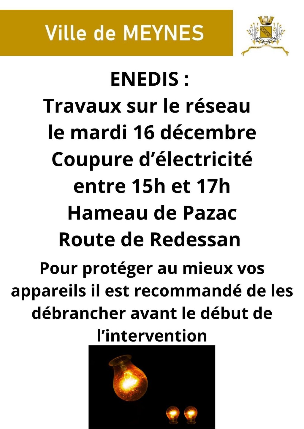 ENEDIS : TRAVAUX SUR LE RÉSEAU LE 16/12